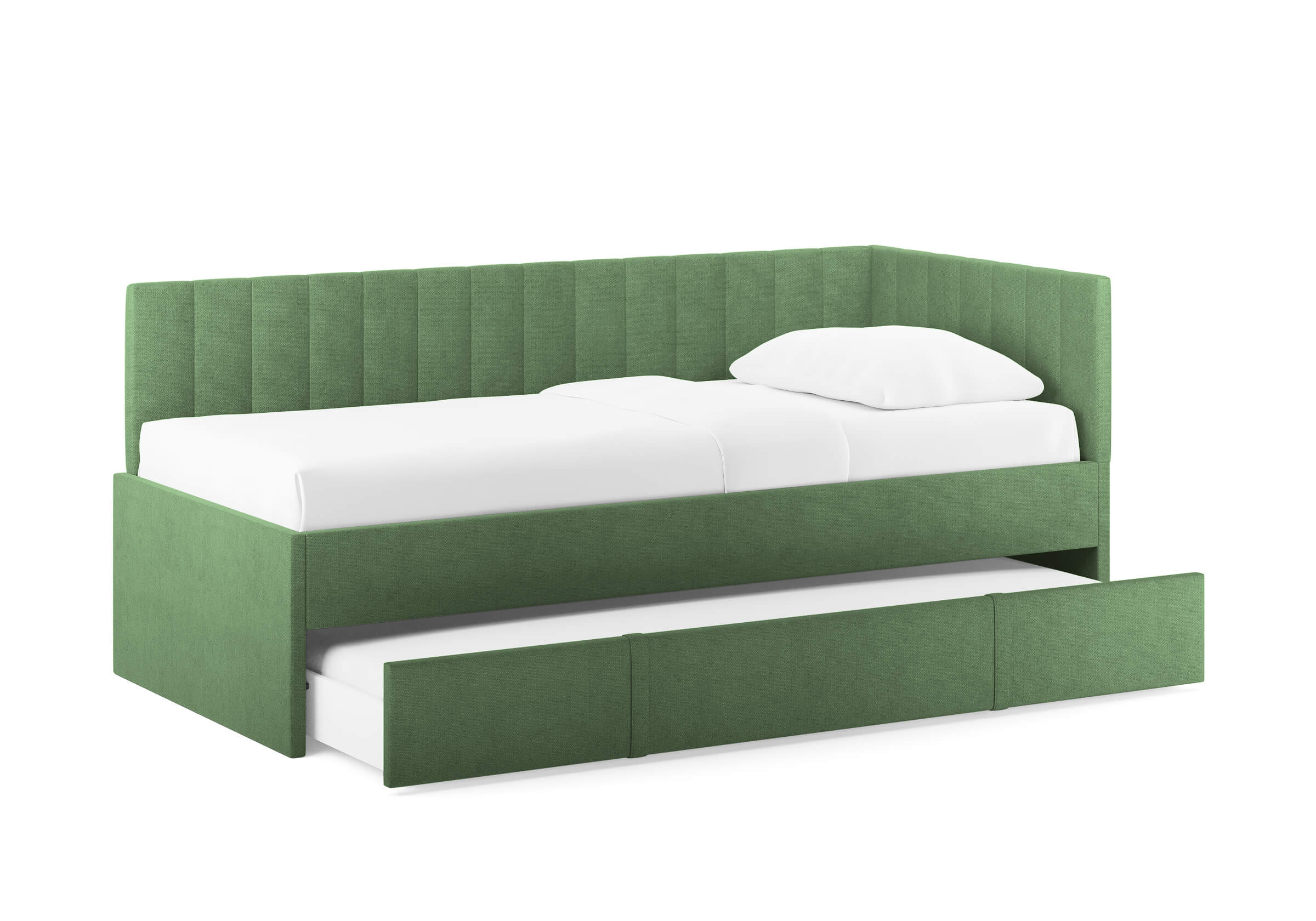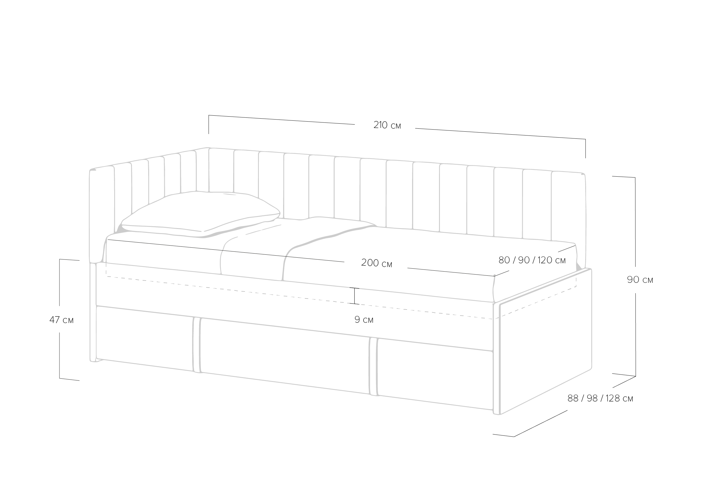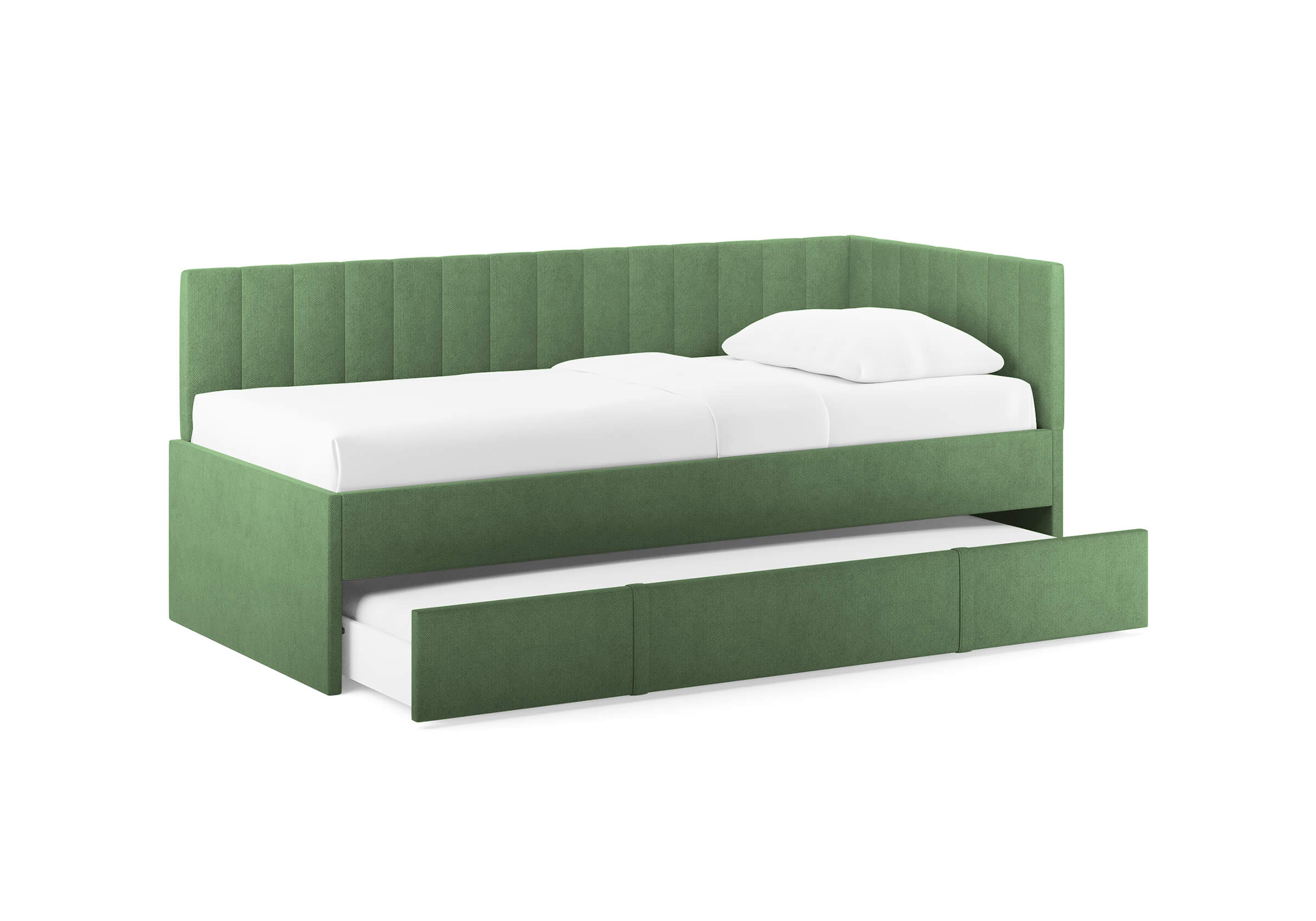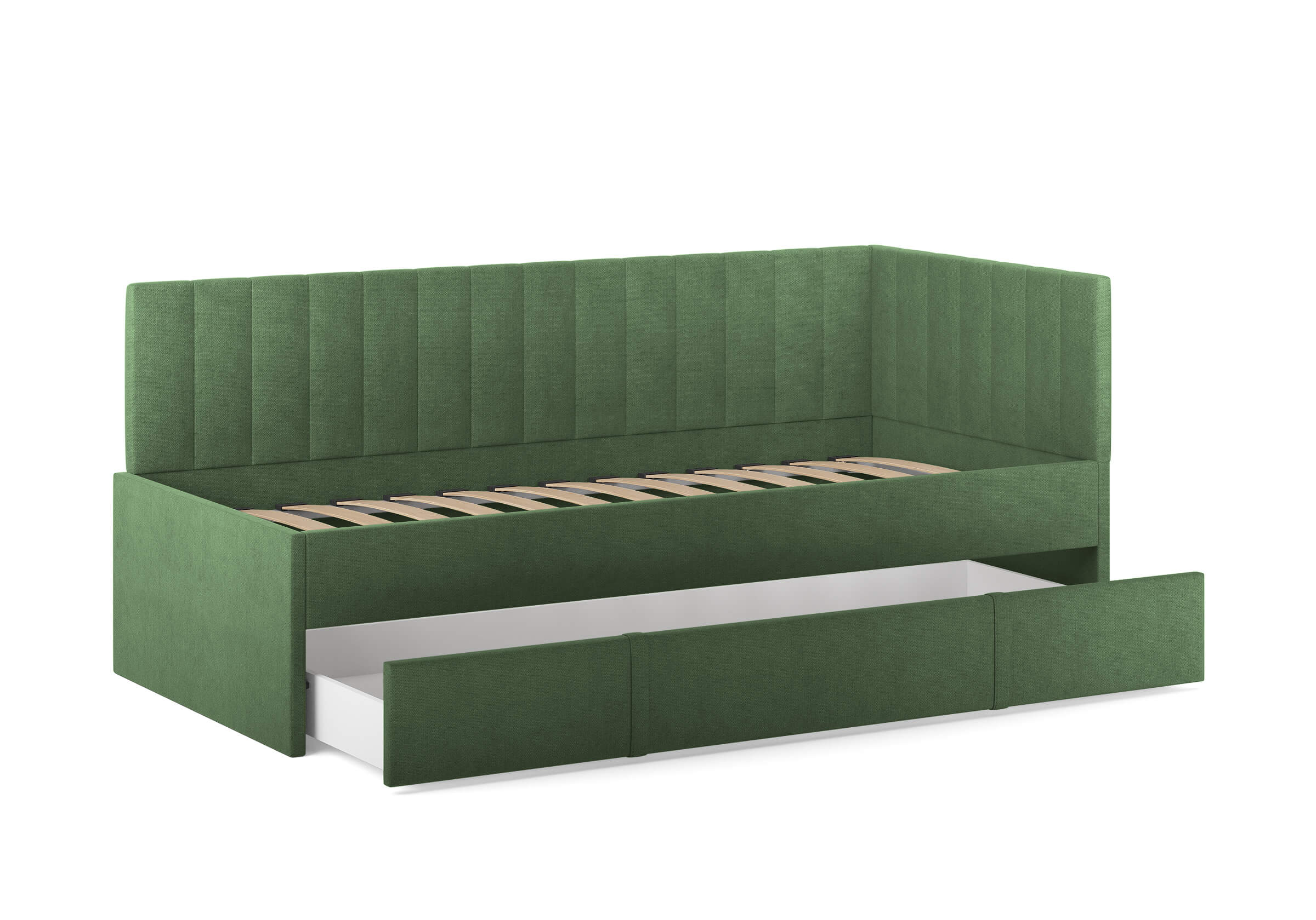 Модуль можно использовать как дополнительное спальное место или вместительный бельевой ящик. Выдвигается полностью для обеспечения уборки под кроватью.