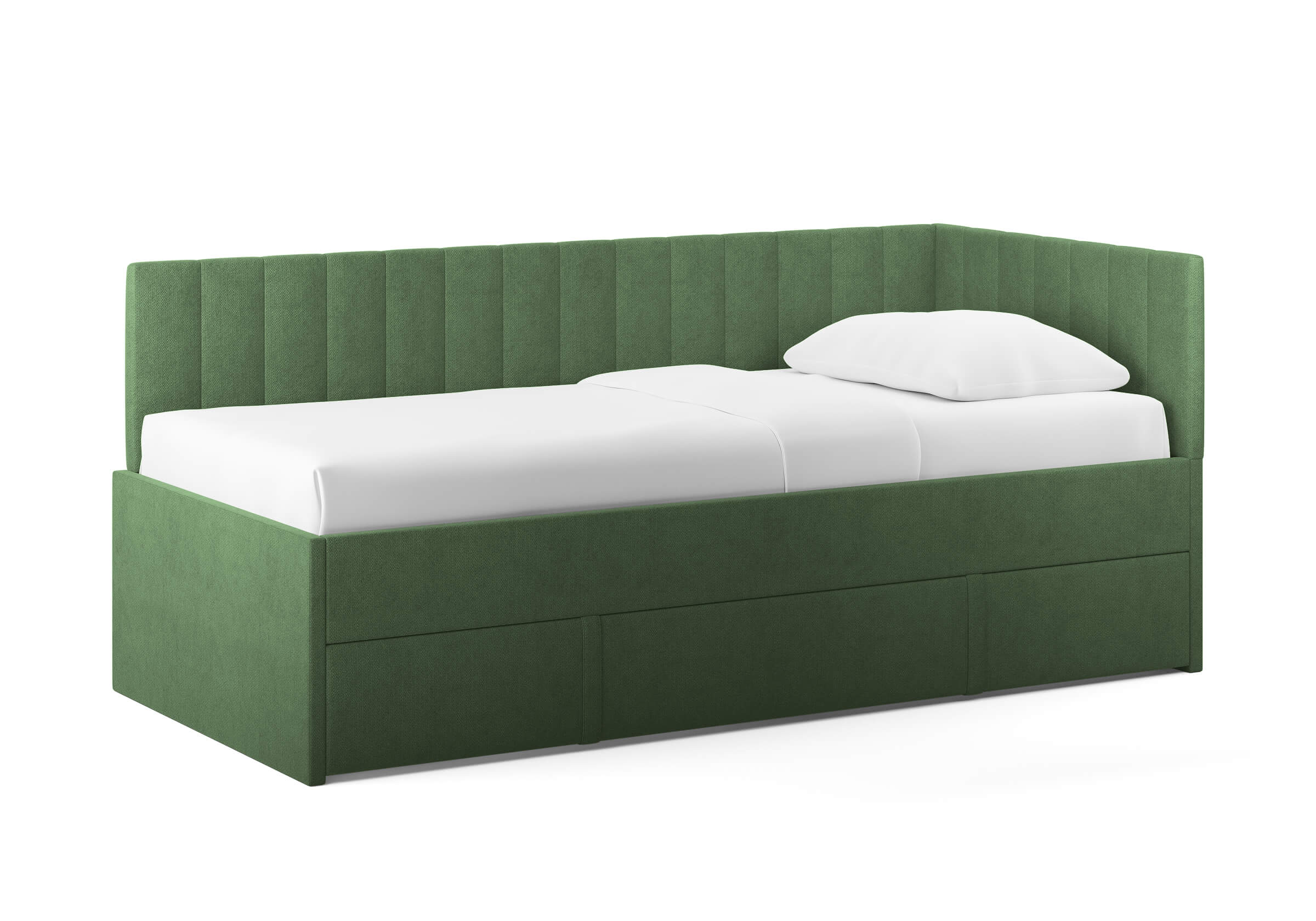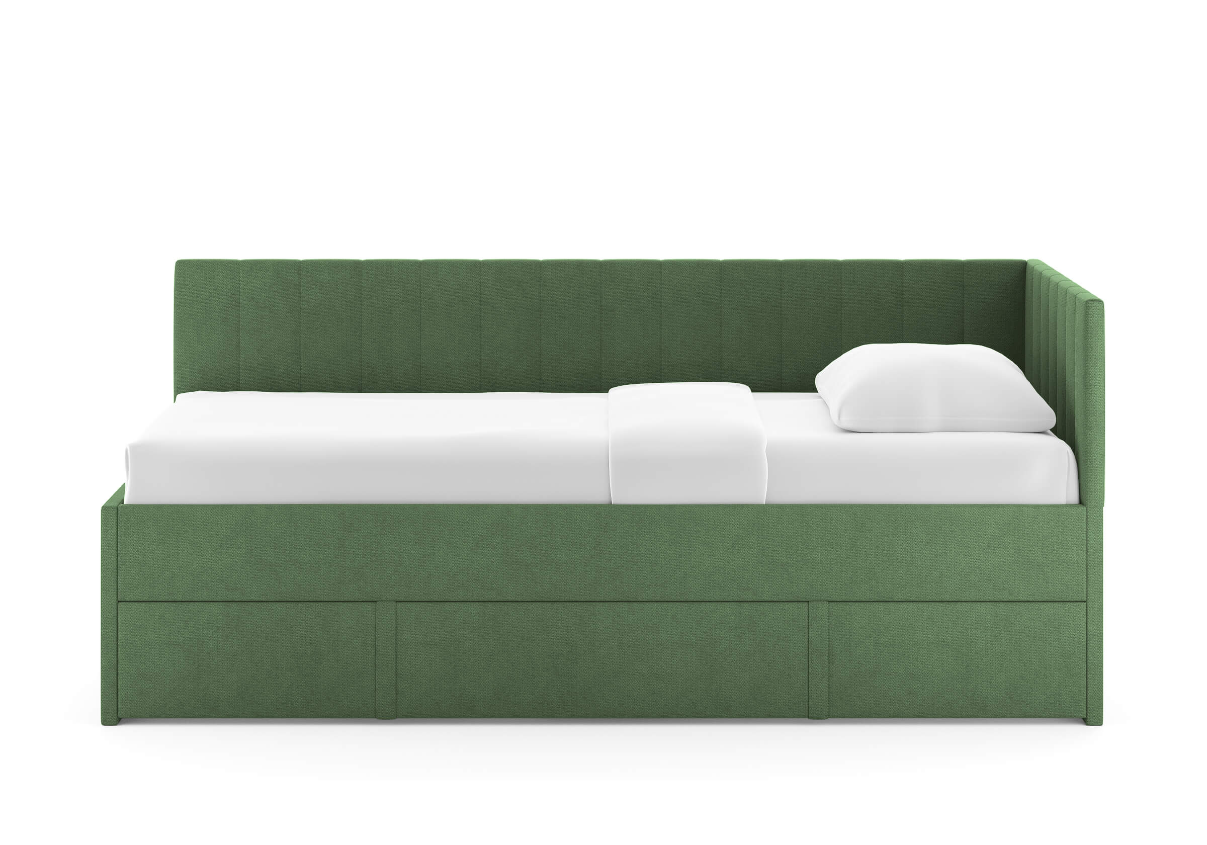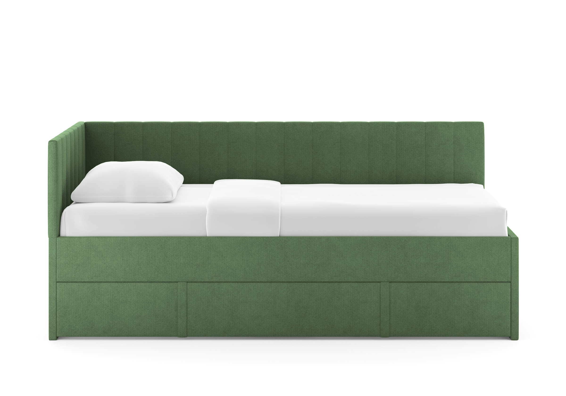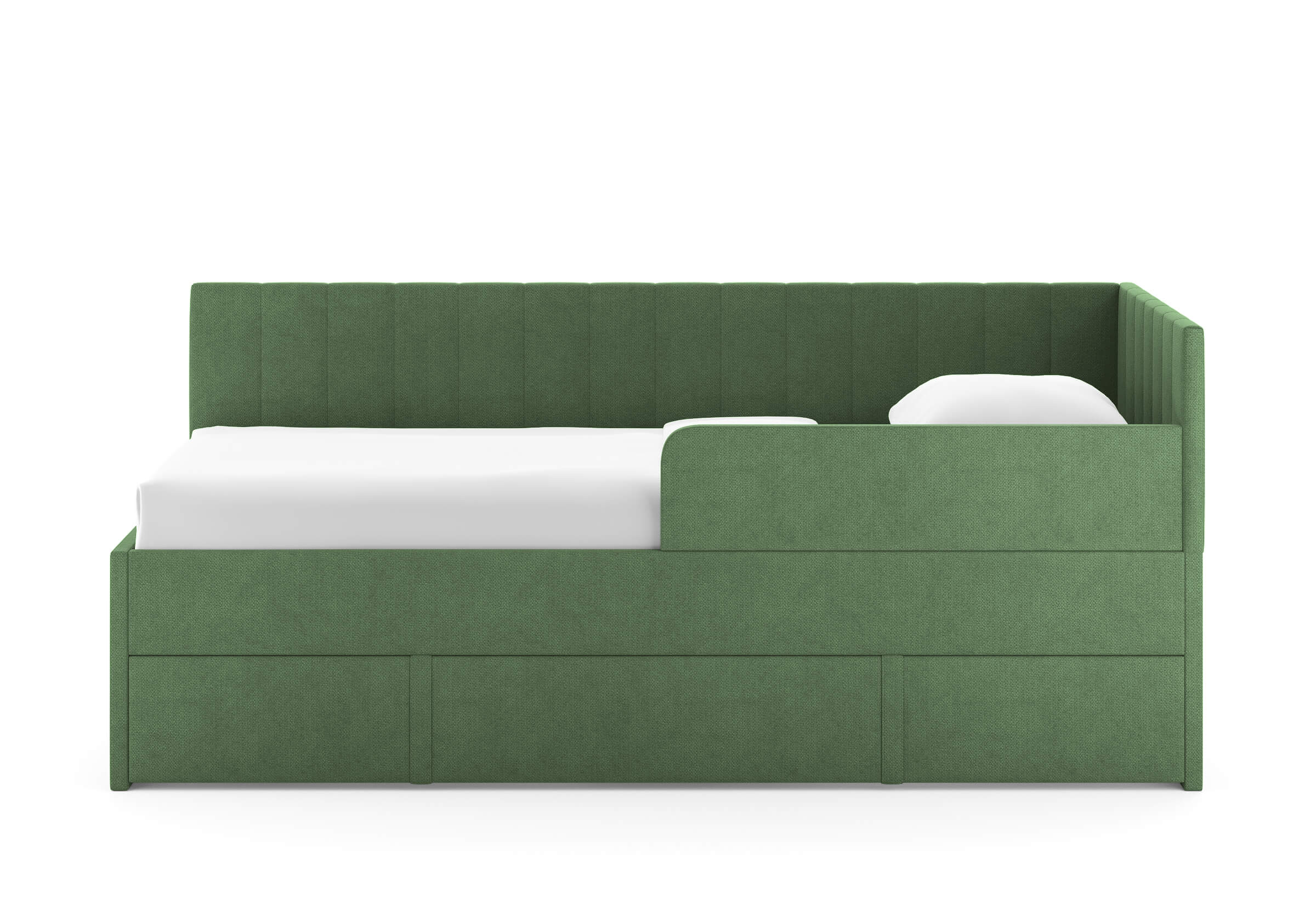 Модуль можно использовать как дополнительное спальное место или вместительный бельевой ящик. Выдвигается полностью для обеспечения уборки под кроватью.